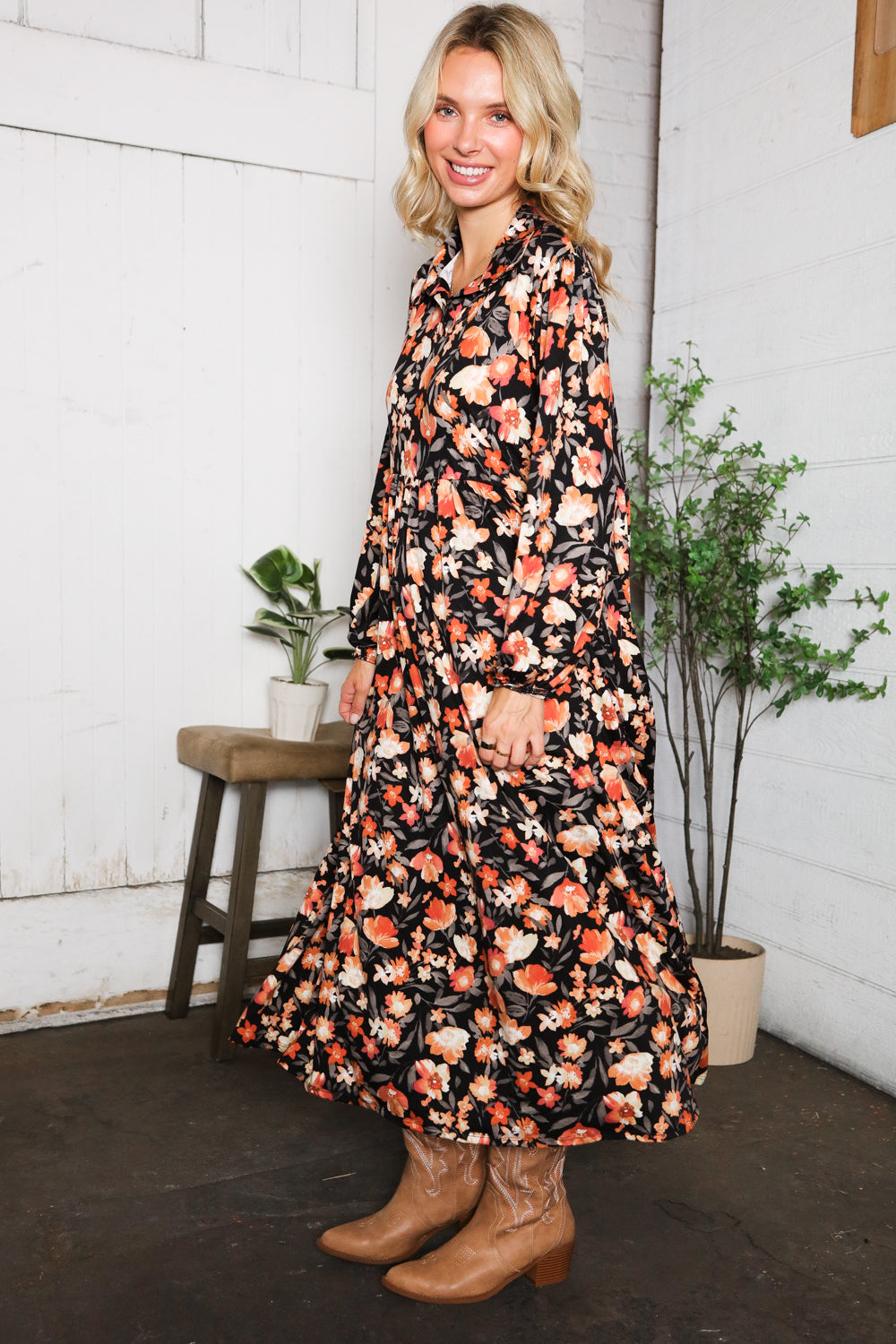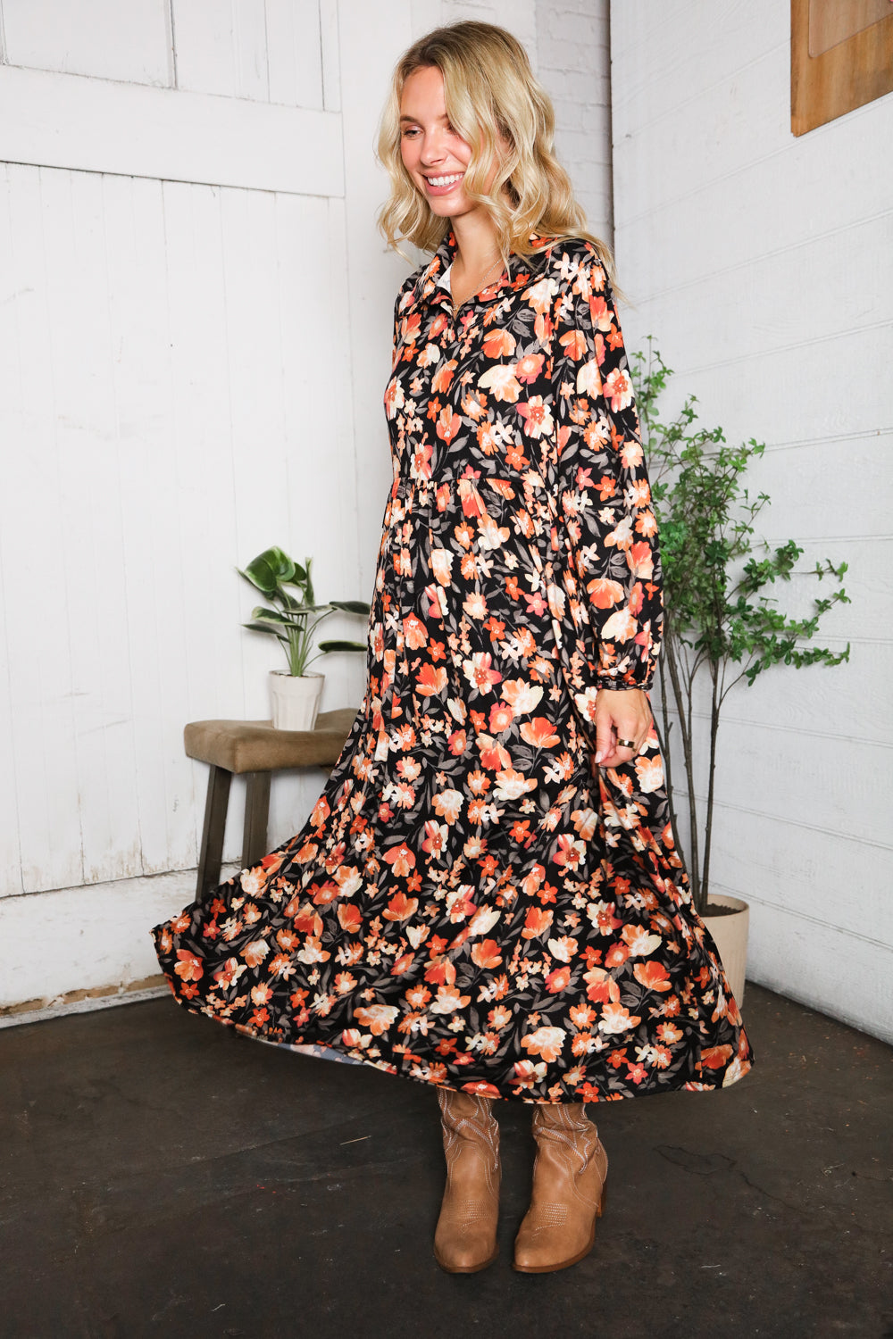 Regular price $19.95This dress is giving all the fall vibes with its pretty floral print. It’s a long length with a fit and flare cut that moves so nicely when you walk. It is a buttery soft fabric. The long sleeves have a slight puff with elastic at the wrist, and the collared neckline gives it a polished touch. This dress also has side pockets.