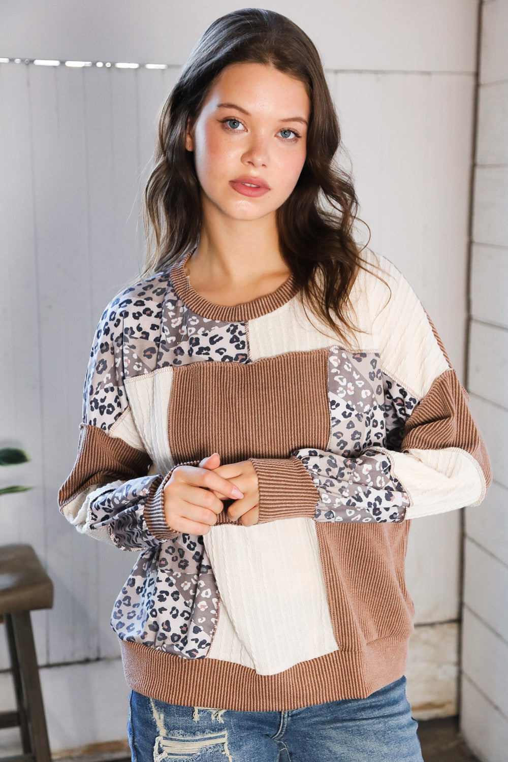 Regular price $12.55This sweater is such a fun mix of cozy and trendy. It’s got the patchwork look with blocks of ribbed knit, cable knit, and leopard print all pieced together in warm neutral shades. The fabric is soft and has a nice stretch, so it feels really comfortable on. The sleeves are a little roomy with fitted cuffs at the wrist which makes it easy to push up if you want. Just too cute!