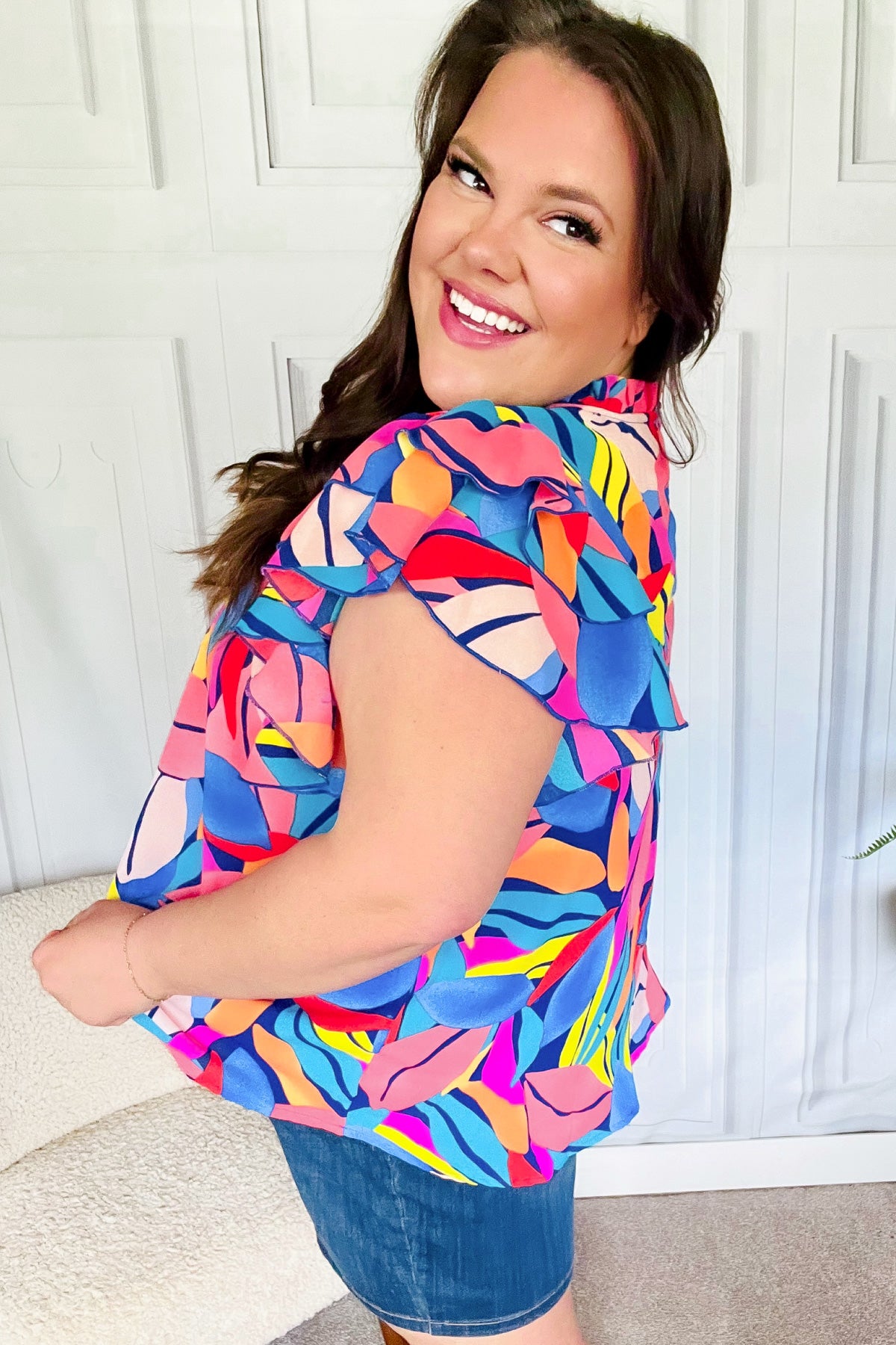Tropical Vibes Blue & Pink Mock Neck Flutter Sleeve Top