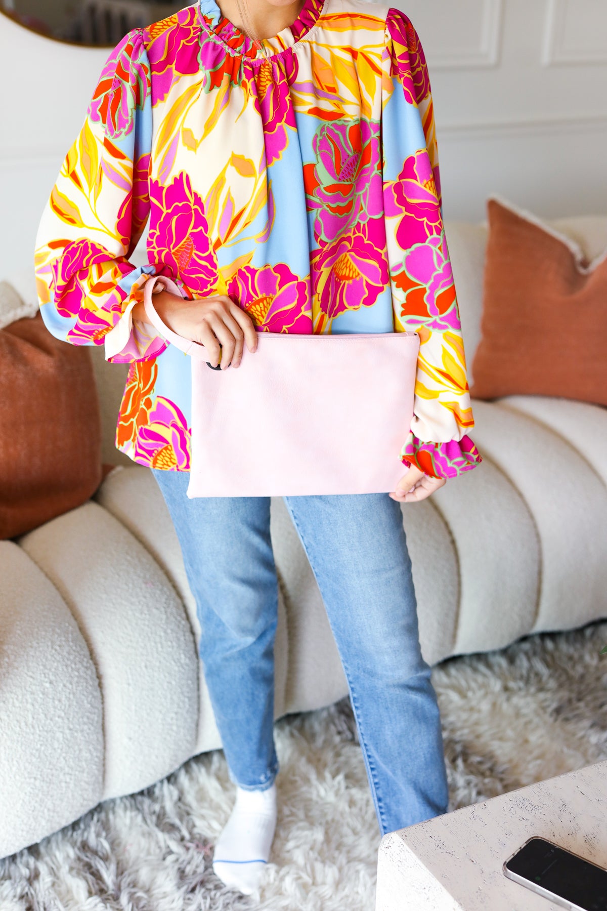 Blush Faux Leather Handle Zipper Clutch
