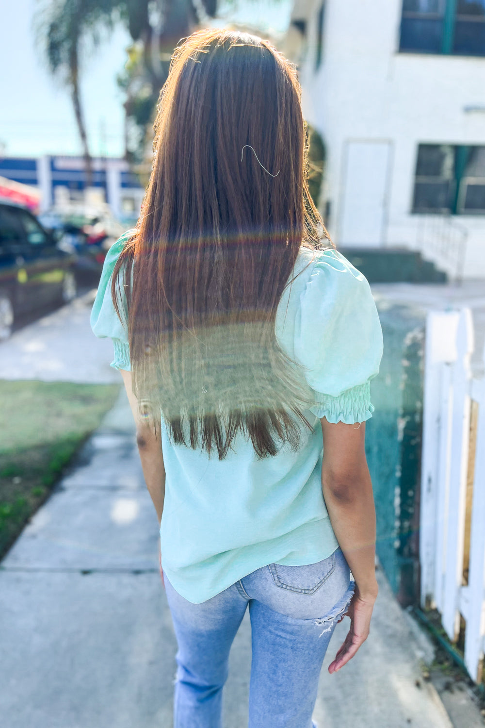 Regular price $11.95 Sale price $7.50Look elegant and put together with this notched neck blouse featuring smocked short sleeves and front seam details. Slightly textured with a smooth, silky feel, this blouse will look flattering on any body type.