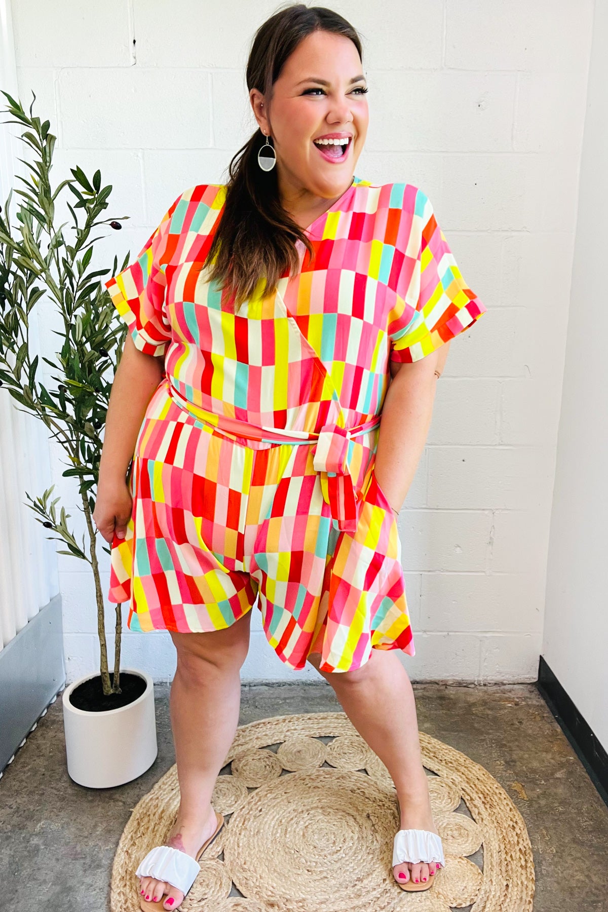 Regular price $17.95 Sale price $6.95Highlight your fun side with this geometric abstract print surplice flared shorts romper with an elastic waist and tie belt. A beautiful drape and side pockets complete this stunning style.