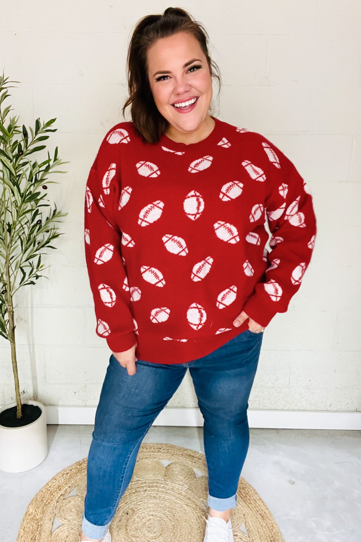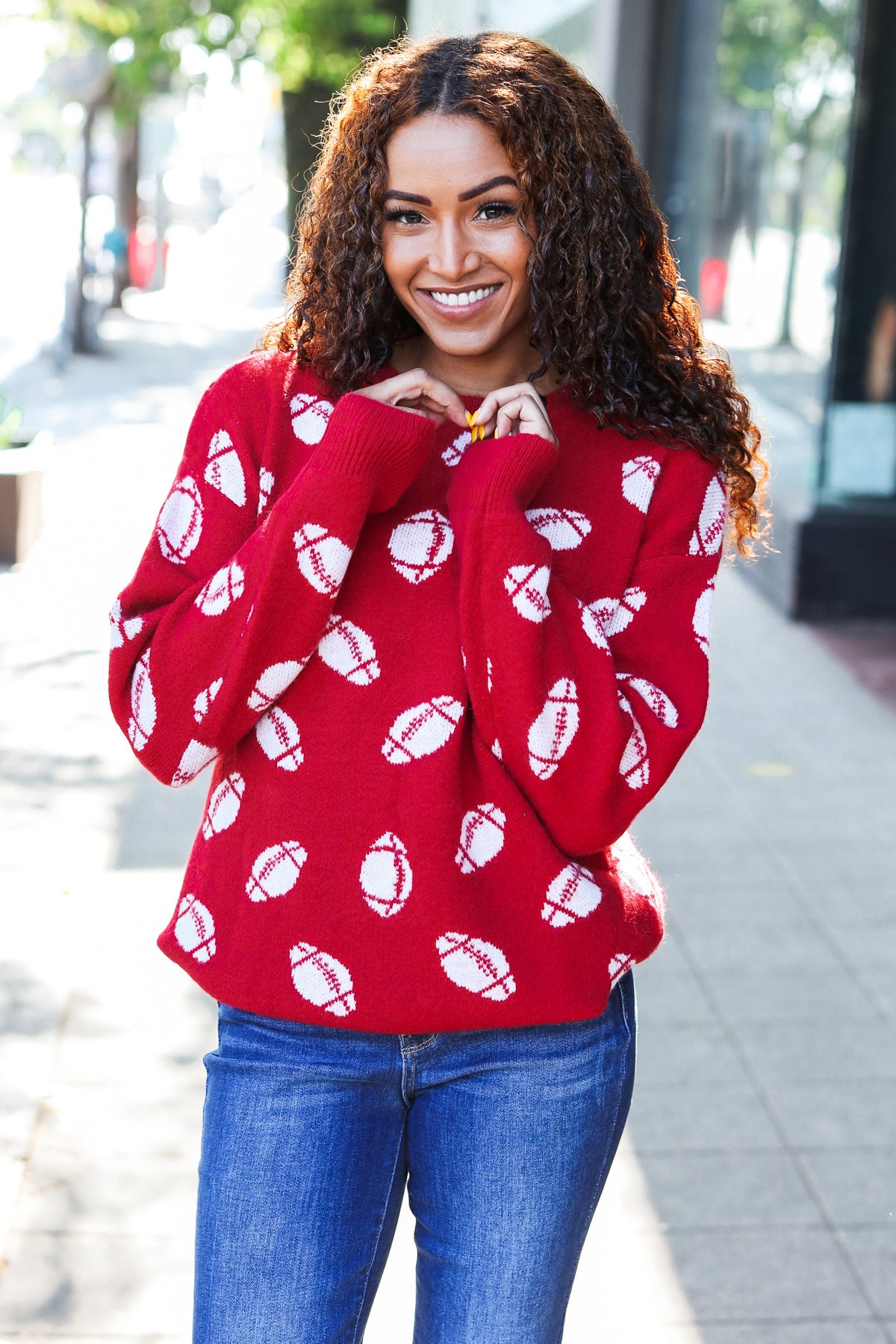 Regular price $22.50 Sale price $9.55Get ready for game day with this football print sweater. Featuring soft jacquard knit, a round neck and a flattering oversized fit, be prepared to steal the show!